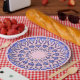 Make your table setting shine with this chic geometric paper plate, featuring a mesmerising circular arrangement of diamands that make a spiritual mandala in shades of royal blue and light blue. Set against a soft pastel pink background, the intricate design is enriched with deep royal blue and violet tones, creating a perfect blend of luxury and modern elegance. Perfect for adding a touch of elegance to birthdays, weddings, bridal showers, or any special occasion..