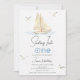 This nautical themed sailing into one first birthday invitation for baby boy features a white sailing boat, seagulls and light blue ship helm word.