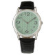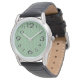 This men's watch has an art deco design of blue and purple half circles connect with lines on a field of light green.
