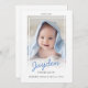 Modern birth announcement template card for baby boys. Add your first photo on the front of the card in the stylish white frame. Your child's first name can be added in blue script font. The child's middle and last name and birth stats follow. You can add the second picture of your baby to the back of the card along with the parents' names.