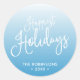 Happiest Holidays Holiday round sticker featuring the words "Happiest Holidays" in a fun brush script against a blue gradient background. Makes a great sticker for Christmas / Winter holidays. Check out other holiday items here https://www.zazzle.com/collections/holiday_christmas_new_year_cards-119015800351034065?rf=238364477188679314