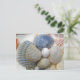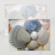 Blue seashells photography postcards. Tropical shells photography includes four cockle shells of blue and tan arranged in a circle with a white moon snail or shark's eye shell in the centre. These seashells came from the Florida gulf coast.