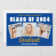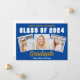This trendy blue, gold, and white custom senior senior portrait photo collage graduate announcement card features varsity letters for the Class of 2025 under your college or high school name. Customise with your favourite 3 graduation photographs and personalise the back with commencement details.