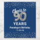 Custom elegant 90th birthday party wine bottle labels featuring a stylish blue background that can be changed to any colour, silver glitter, ninety silver hellium balloons, and a modern text template that is easy to personalise.