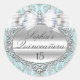 Quinceanera Sticker. Blue damask & silver jewel bow. Exclusive Zazzle. Customise with your own details. PLEASE NOTE all flat images! They Do NOT have real silver, bows, Diamonds or Jewels!!