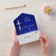 This pretty all season wedding invitation with tear away RSVP card in tones of silver and royal blue will give a sense of elegance to your wedding! The inside has a lovely silver cross with two silver hearts interlocked at its foot. There's a subtle silver confetti overlay to add a bit of sparkle. Your wedding text is also in silver at the right of the cross and hearts image. Everything is placed on a stunning royal blue gradient background. The bottom tear away RSVP portion has the swirl image continued, but is white to make it easy for your respondent to mark. If you don't need a text field, just blank it out, and if you need help organising different text, please contact us. We are always happy to help. If you're having a buffet reception, we can work with you to re-design the RSVP portion, so don't hesitate to ask! An added bonus and personal touch is your own photograph on the back flap.