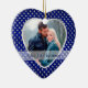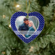 This is a wonderful photo template Christmas ornament for a newlywed couple, or any couple who is celebrating their first Christmas holiday together. Your own photograph is centre stage on the front inside a silver lined heart frame which is placed on a blue and silver diamond pattern background. A banner at the bottom holds your custom text in dark blue. The back of the ornament has a silver heart with more custom text on the same background. A beautiful keepsake!