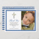 Elegant first holy communion thank you cards featuring a simple white background that can be changed to any colour, a navy blue double border, a religious silver cross with white flowers, a photo of your child, and a modern thank you template that is easy to personalise.