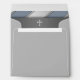 Elegant slate blue, silver and white diagonal stripes with white cross on the inside boys first holy communion invitation envelope.