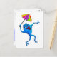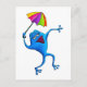 This charming theatrical bright blue frog is singing for joy in the summer rain while dancing with a colourful umbrella.