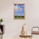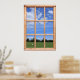 It's summertime and a beautiful day in the park with a blue sky of fluffy white clouds. Framed by a wood window frame, you can see the green of the park lined by trees, and in the foreground a sandy dog enjoying the wide open space that is a true dog heaven. Put it on the wall of your home or office for a fake window with your own park view.