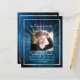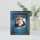 An elegant 2-page program. A dark blue sky as background, a faux silver looking frame, and space for a photo. Light beams behind the photo. Personalise and add name, dates and your text.