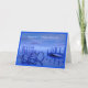 A shiny blue glass sleigh in the foreground of this artistic card is reflected on darker blue ice. In the background there is a graceful curving bridge. The message is Happy Holidays. The interior template reads Wishing You a Joyous Holiday Season. This original art was created by Judi Suni Hall for Gingezel in Bryce.