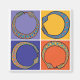 Four blue snakes bite their tales on these squares of blue, red and orange.