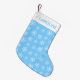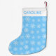 A pattern of white snowflakes on a light blue background. The top of the stocking is white with a custom name in matching blue.