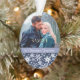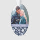 This holiday keepsake ornament features your own photograph, with a bottom border of white snowflakes on a dark blue background. A light blue grey banner holds your customised text in white. The back of the ornament has the same photo and snowflake border, with a second text field for you to customise. This makes a nice keepsake gift for newlyweds or any couple. *Tip for placing your photograph -- after uploading your photo, use "Customise it" and the arrow keys to move it around for the best appearance.*