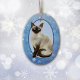 Here is a pretty Siamese cat themed Christmas ornament that makes a nice addition to a household that loves a Siamese! The front of the ornament features a pretty watercolor image of a blue eyed Siamese cat sitting in front of a light blue oval that is framed with a blue and white snowflake border. The back of the ornament has the same snowflake border and blue oval, with your custom text in matching blue. Make it say whatever you'd like!