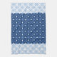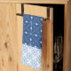This seasonal kitchen towel has a wintry intricate design with blue and white patterns of snowflakes and ice crystals.