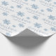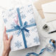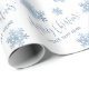 Christmas gift wrapping paper feature snow flakes, modern calligraphy merry Christmas script and personalised text in winter blue and white.