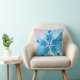 Beautiful snowflakes throw pillow features a blue and lavender with small muted snowflakes on front with a big watercolor blue snowflake in the centre, the back features a muted lavender, pink, and blue background with lots of pretty blue watercolor snowflakes in various shapes and sizes!