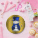 A cute and colourful Christmas pattern featuring snowmen dressed in blue velvet top hat and vests, on a festive golden background with gold stars to add a stylish and whimsical touch to your Christmas home decorations this year.