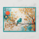 The colour palette, featuring rich blues, golden hues, and the orange red of the blood moon, creates a visually stunning composition that resonates with the heart of a songbird lover. The abstract watercolor technique adds a touch of whimsy to the intricate patterns of the leaves, turning this postcard into a visual delight.