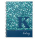 An aqua sparkly glitter background with a navy monogram initial and your name underneath in a white script on a navy background.