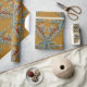 An elegant, sophisticated and festive holiday wrapping paper featuring blue spruce branches and red berries in lattice formation on a gold background.