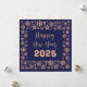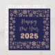 Square wish card Happy New Year written in English in gold font with a lot of golden stars on a blue background- editable text and background