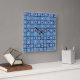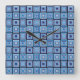 Wall clock with a bold and funky design of little squares in various shades of blue. The repetition in this design has created an optical illusion and the squares seem to be moving and popping out at you.