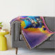 A quality printed throw has its advantages. This is a much finer weave throw than its loopier cousins, and though lighter, it is worth the investment for custom room accessorizing. The back is much prettier than the typical brown, and the fringe on the long sides very vivid, the selvage nicely done. Before photographing, I washed the throw in cold water, delicate, with a thicker woven throw the same size. On tumble dry low, this throw was dry in half the time as the other. This is a very practical quality if you use throws for furniture covers or to wrap up in frequently. The sleekness of the fabric makes it a great layer for accenting or protecting without the feeling of sitting on too much stuff. Perfect for napping or when you feel a light chill coming on. The color printing is beautiful and on this fabric, matched the design and color of my Photoshop image. This is an advantage for blending room fabrics and colors. The fringe on the short sides prints the colors from the design image and therefore varies from the side fringe. I streaked a white fractal line through the plaid pattern to give the illusion of weaving. This printed as crisp as an illusory thread, and put some white in the short side fringe, showing another advantage of print vs loomed- for artistic purposes, line lines, detail, and color integrity can be planned and preserved. My loomed throws have color limitations and more of a needlepoint texture. Print throws reproduce an exact image. The throw felt a little stiff straight out of the package, but this went away in the first delicate wash. Of course I searched the wash water for ink or bleeding and there was none.