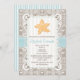 Pretty beach and nautical themed bridal shower invitations with a yellow starfish, delicate swirl framed border and printed aqua blue contrast stitch look design on a subtle striped background with a damask and heart pattern. The back of this wedding shower invitation has a blue and white stripes seersucker print. Artwork © Chrissy H. Studios, LLC. All Rights Reserved.