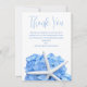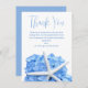 Blue floral wedding thank you message cards. A pretty starfish and hydrangea card design with big "thank you" at the top in blue. Add a message and signature using the paragraph template. Perfect for newlyweds or brides.