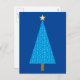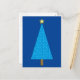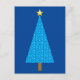 Postcard with a simplified modern take on a classic Christmas tree motif, cerulean blue, satin textured stars on aqua with a cobalt blue background
