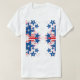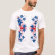A white t-shirt featuring a vibrant design of red, white, and blue stars and stripes.