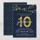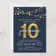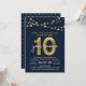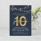 Elegant 10 Year Class Reunion invitation featuring strings of lights and "10" in faux gold foil with "year reunion" in white against a dark blue background on the front and a dark blue and faux gold polka dot pattern back side. Check out other matching items here https://www.zazzle.com/collections/school_reunion-119258151199573326?rf=238364477188679314