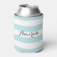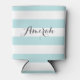 Customisable can coolers featuring modern light blue and white stripes pattern and grey modern calligraphy script. Other colours, patterns and similar items are available in my store.