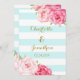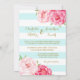 Wedding invitation custom template cards in light pastel aqua teal turquoise sky blue and white stripes pattern with pink fuchsia hot pink rustic vintage flowers and gold handwritten style vintage text. Customise these invitations with your wedding details. Available in matching products for all of your wedding needs.