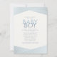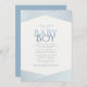 Modern diagonal stripes, blue baby shower invitation to welcome a newborn baby boy. Silver grey with light blue stripes that "wrap" the top and bottom of 5x7 inch custom card. Simple printed blue font is all upper case, with larger lettering in the centre.