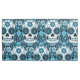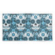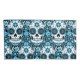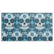 Dia de los Muertos sugar skull in colourful hues of blue surrounded by flowers.