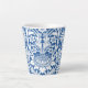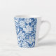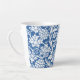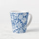 A latte coffee mug with a William Morris (18134-1896) floral pattern entitled Sunflower (1879) in a classic blue and white palette. Large sunflowers with graceful grape vines and leaves. He was a British artist during the arts and crafts period, who designed wallpaper and textiles.