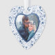 A pretty frame of blue floral swirls with a subtle lighter pattern in the background surrounds your own photograph on this Valentine ornament. Within the blue pattern border is a shiny darker blue heart shaped frame. The other side has the same background and blue border frame with a white interior. Your custom text is in matching blue on the interior. Makes a perfect gift, and complements most photographs.