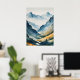 This captivating horizontal poster presents a breathtaking mountain scene, masterfully rendered in soothing shades of blue and tan that evoke a sense of serenity and awe. At the heart of the composition, a crystal-clear stream meanders gracefully down the mountain, its waters reflecting the sky's azure hue, creating a harmonious blend of colours that exudes tranquillity. The mountains, depicted in varying shades of tan, rise majestically against the backdrop, their peaks touching the sky, suggesting both their grandeur and the timeless beauty of nature.