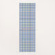 This yoga mat features a colourful plaid pattern in white, blue and brownish-grey (taupe).