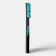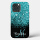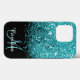Blue, teal glitter, personalised with your name and monogram. Mobile iPhone 13 Pro phone case.