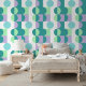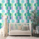 This design showcases a modern geometric pattern with circles and half-circles in shades of seafoam teal blue, light green, and violet purple against a white backdrop. It's an elegant and stylish design that embodies eclectic minimalism, perfect for artistic interior designers, decor enthusiasts, trendsetters, and fans of vintage retro or abstract digital geometric motifs. This ornate yet funky hipster pattern is versatile, available on a variety of contemporary home decor items, making it suitable for enhancing the ambiance of spaces such as master or children's bedrooms, kitchens, nurseries, living rooms, woman caves, college dorms, condos, studios, or apartments.