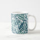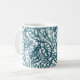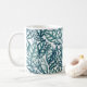 This is a pattern of blue, turquoise and white tropical leaves on a white background.