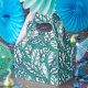 This is a pattern of blue, turquoise and white tropical leaves on a teal background.