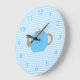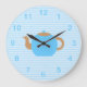 A design featuring a blue and brown teapot, the background is a light blue striped pattern.