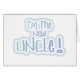 Shades of blue text reads "I'm the new uncle!" on new uncle T-shirts, mugs, buttons, and other proud new uncle items.